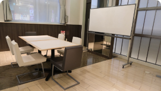 入口入ってすぐの場所にミーティングスペースを設置。最大6名まで打ち合わせにご利用いただけます。(ホワイトボードは画像のものとサイズ・形状が異なります)