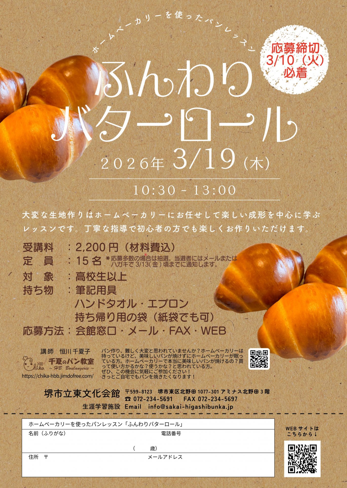★WEBフォームでお申込みの際は、ご意見・お問い合わせ欄に、講座名(ふんわりバターロール)とご記入をお願いします。
