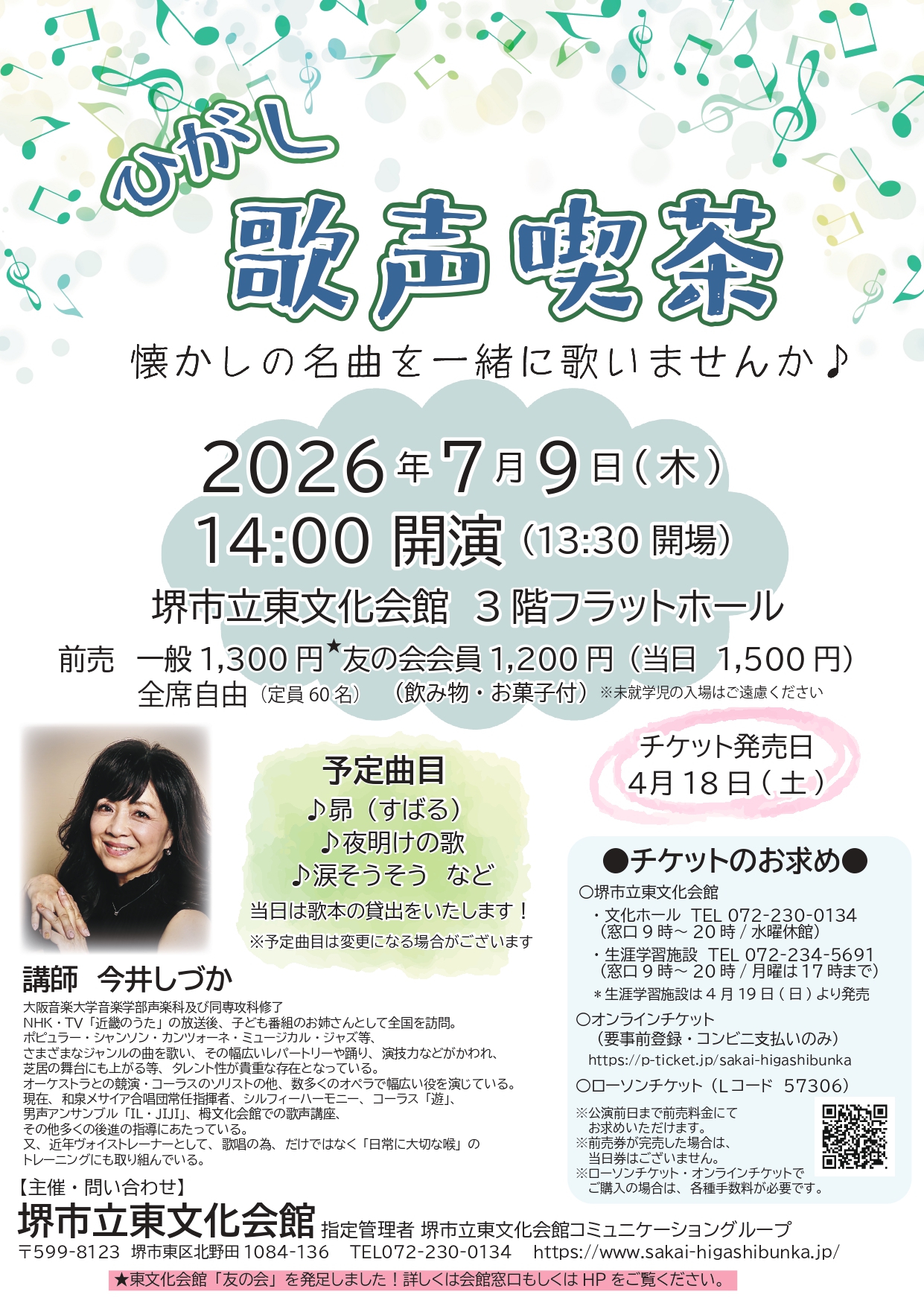 公演・イベント一覧 堺市立東文化会館で開催されるイベントの一覧です。 4月 5月 6月 7月 8月 9月 4月 5月 6月 7月 8月 9月 - 音楽 主催発売中 音楽のあるひととき in HIGASHI Vol.9 ~初夏のドイツ便り -Romantische kammermusik!- ~ 開催日 2026年7月4日(土) 14:30開演(14:00開場) - 音楽 主催発売中 ひがし歌声喫茶 開催日 2026年7月9日(木) 14:00開演(13:30開場) - 映画 主催近日発売 みんなのシネマ なつやすみ「たべっ子どうぶつ THE MOVIE」 開催日 2026年7月28日(火) ①10:00開演(9:30開場) ②13:30開演(13:00開場)